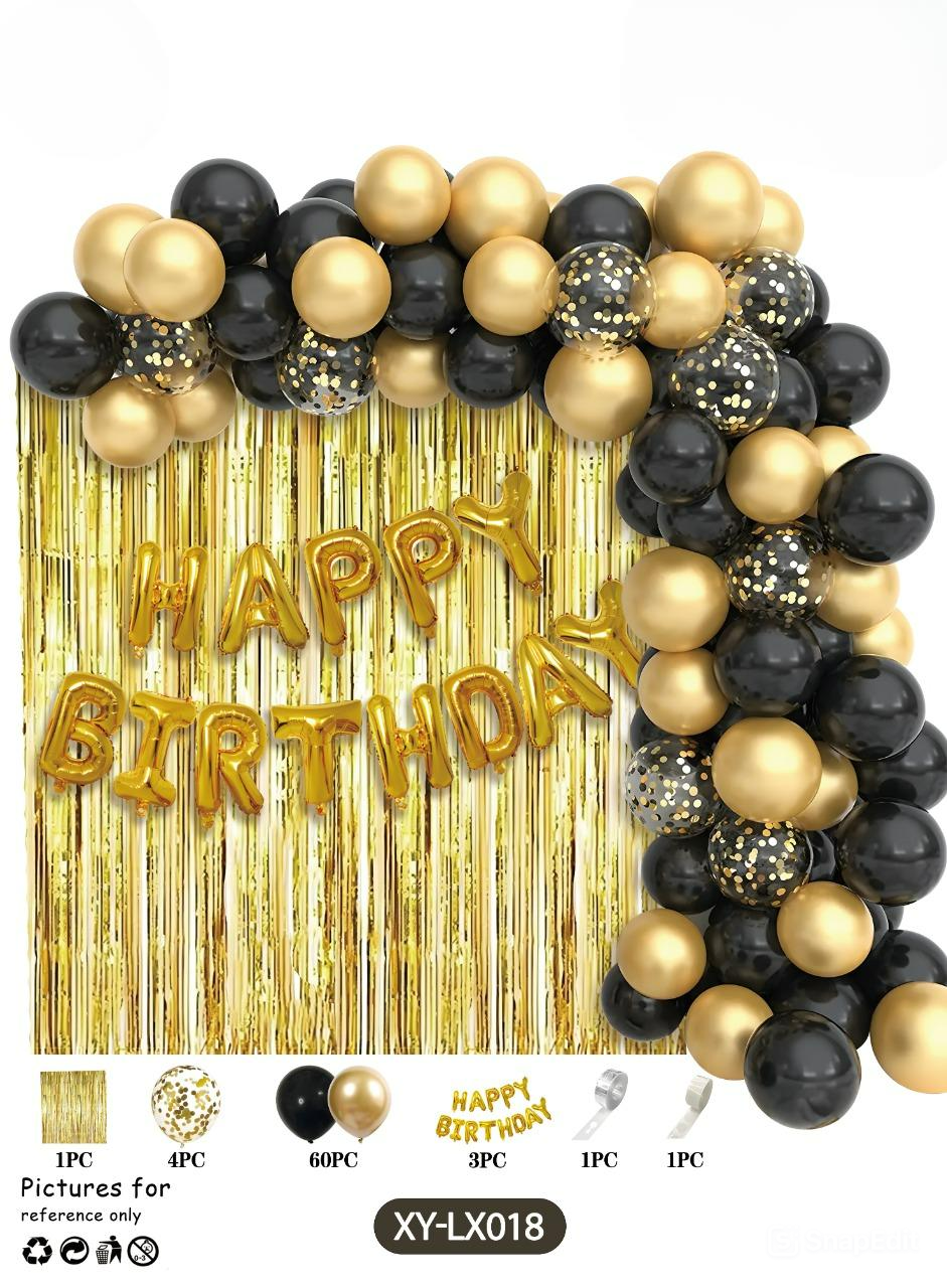 Elevate your birthday party with Gleam Haven’s “Elegant Black & Gold” Birthday Balloon Decoration Set (XY-LX018). Featuring a luxurious combination of black and gold balloons, shimmering gold curtains, and stylish accents, this set is perfect for creating a glamorous and unforgettable atmosphere.